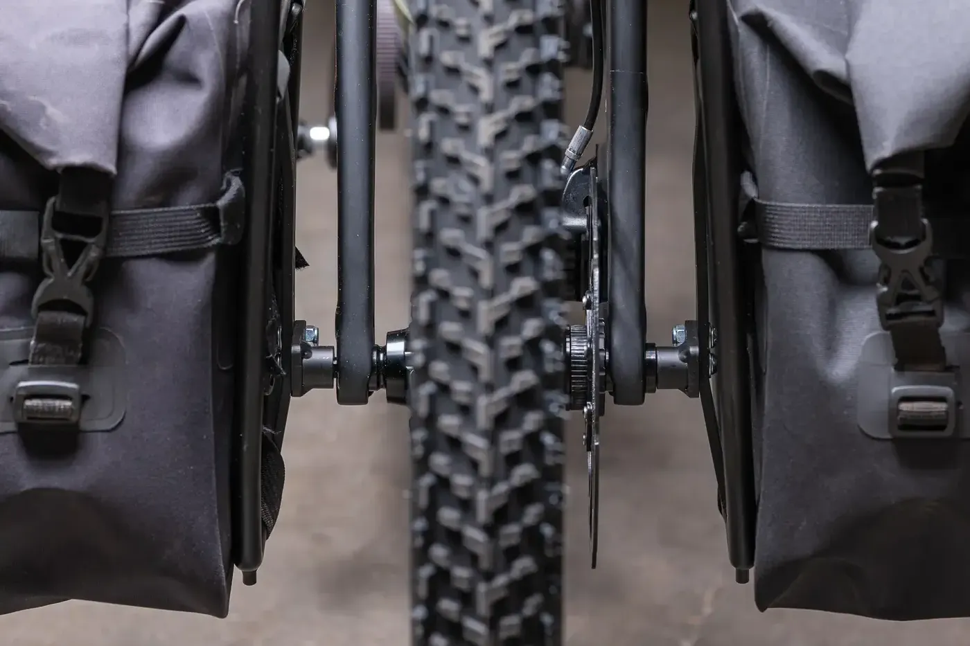 I telai laterali estesi con binari extra bassi sostengono il peso delle borse sul centro della ruota invece che 15 cm sopra di essa come nei portapacchi standard, ad esempio il Divide. Ciò abbassa notevolmente il baricentro della bicicletta e garantisce una manovrabilità estremamente stabile.