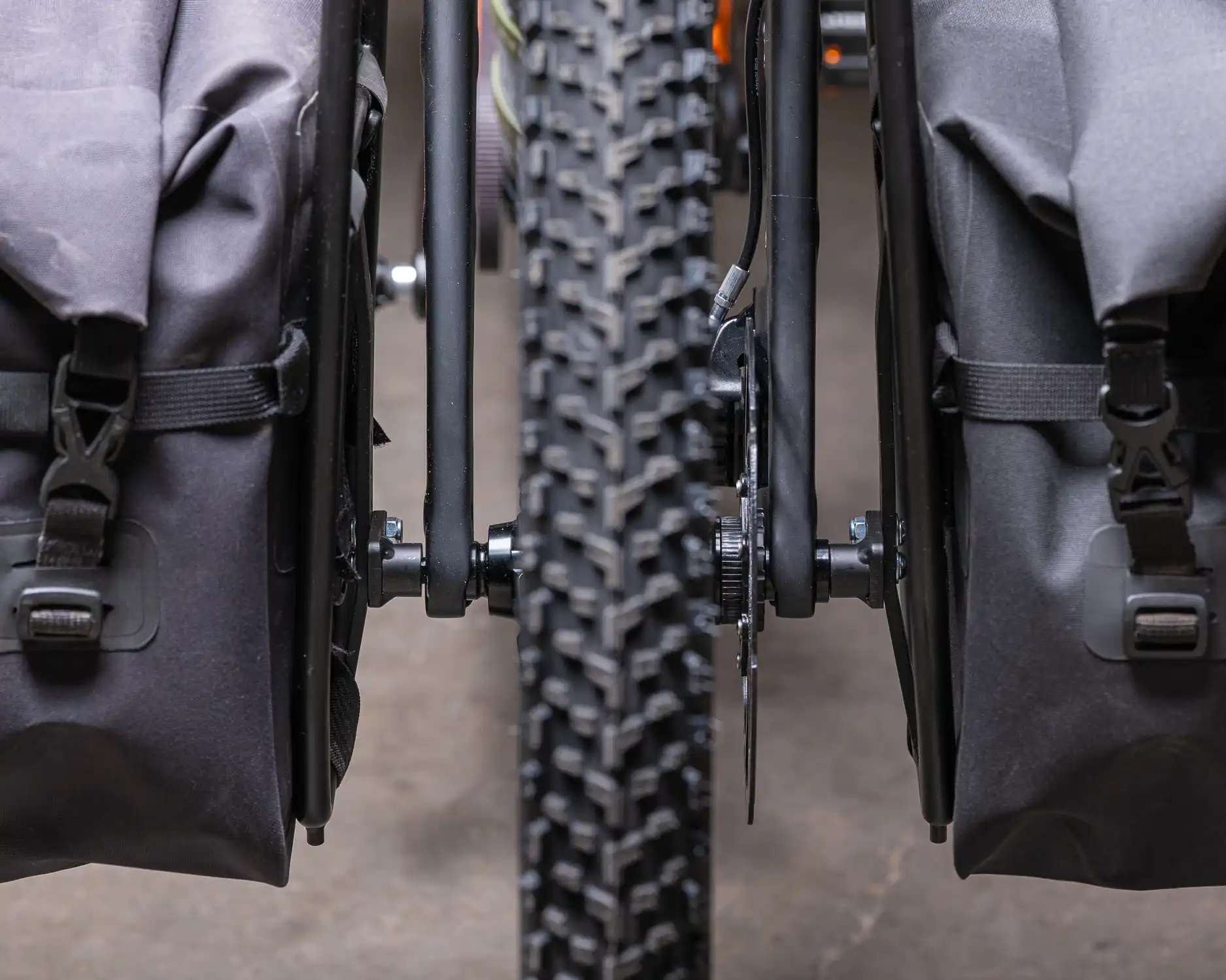 The extended side frames with extra low pannier rails carry the weight of panniers on the wheel center instead of 6” above it like a standard rack, such as the Divide. This dramatically lowers the bike’s center of gravity and provides ultra stable handling. The Impala Lowrider comes eyelet mount ready with optional fit kits available for thru axle or QR mounting.