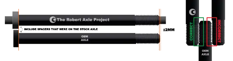 - Compare your stock thru axle to the thru axle provided in your Fit Kit to verify they match. The axles' thread pitch should match and the shaft length should be within +/- 2 mm. Use enclosed spacers as needed to match the length and taper of your stock axle.