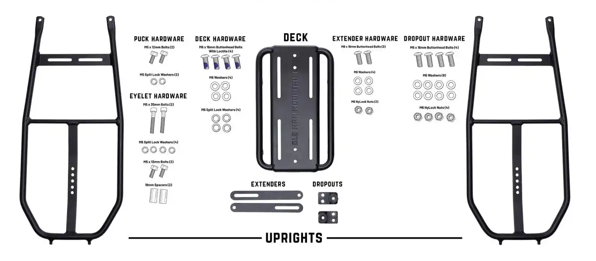 This rack is eyelet-mount ready out of the box. If your bike does not have upper and lower eyelets, Old Man Mountain offers a full-line of Fit Kits for thru axles or QR skewers.